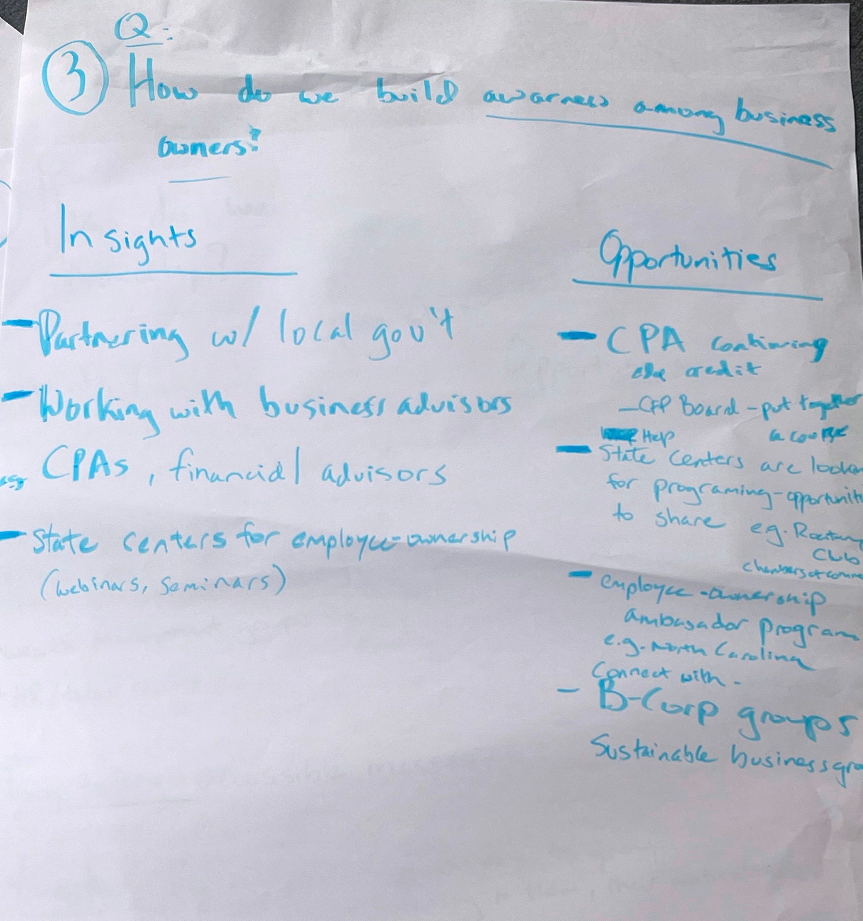 Project Equity, EO+WD, and Purpose Owned hosted a one-day convening focused on advancing and expanding the field of purpose trust ownership in Washington, D.C. It was an enriching experience that allowed us all to connect with a diverse group of people, including attorneys, academics, consultants, and funders, each bringing varying levels of expertise. One of the questions we asked was: How do we bring awareness among business owners? The responses (pictured above) hold significant potential and prove that together we can draft up brilliant ideas to drive this field forward.