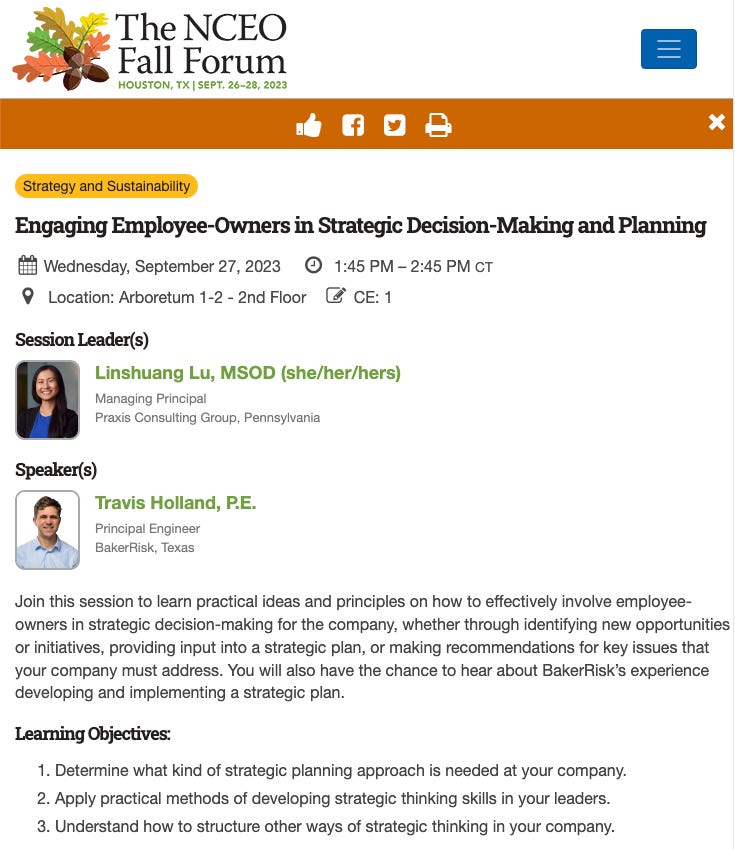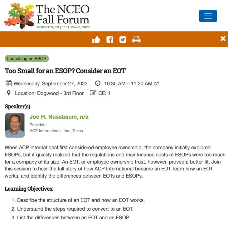 The National Center for Employee Ownership is the largest employee ownership advocacy organization in the US. Their annual Fall Forum is in Houston next month.