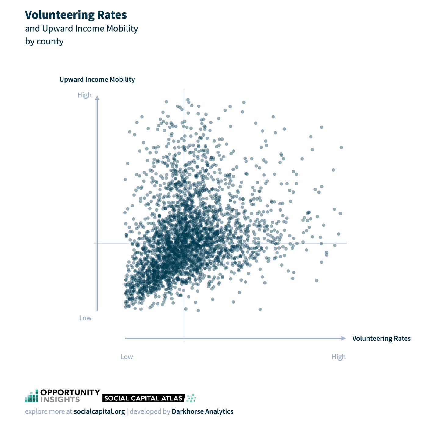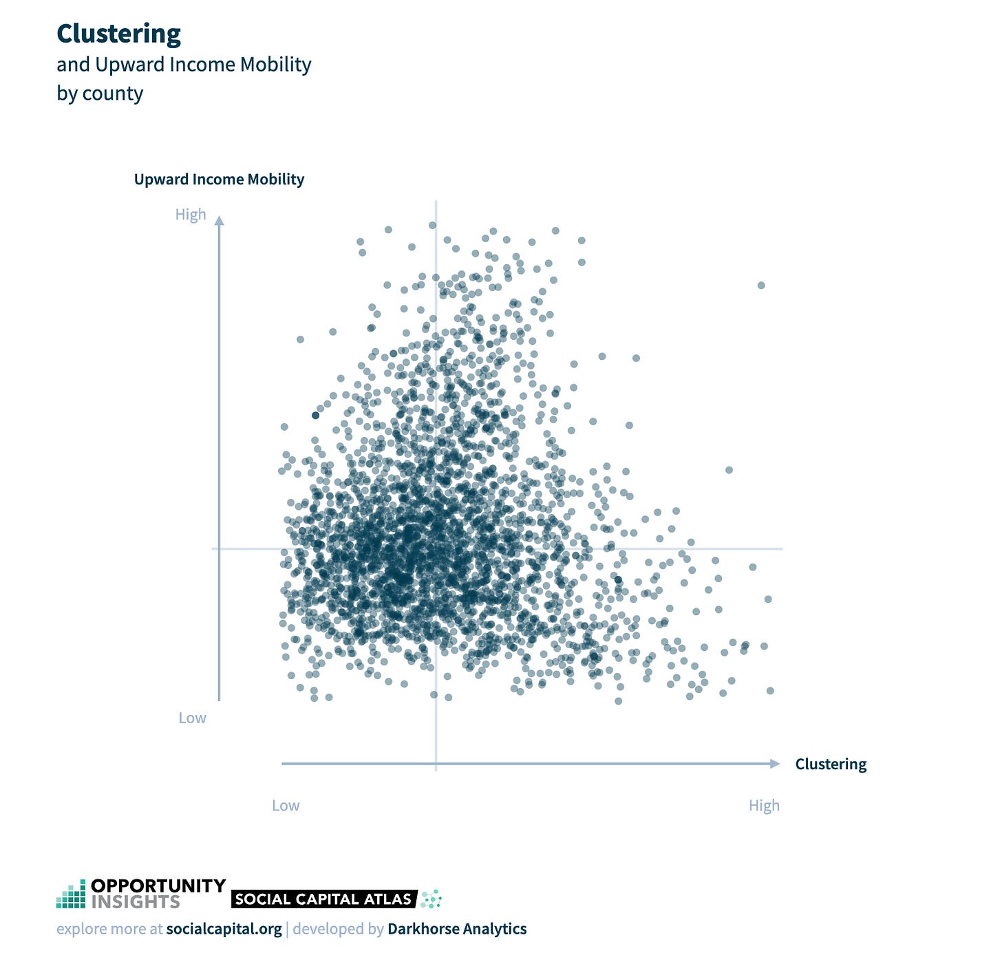 Unlike economic connectedness, measures of network cohesiveness and civic engagement are not strongly associated with upward mobility. There are many communities that have tightly knit friendship networks (e.g., where one’s friends also tend to be friends with each other) or that have high levels of civic engagement (e.g., high rates of volunteering) yet have low levels of upward mobility.