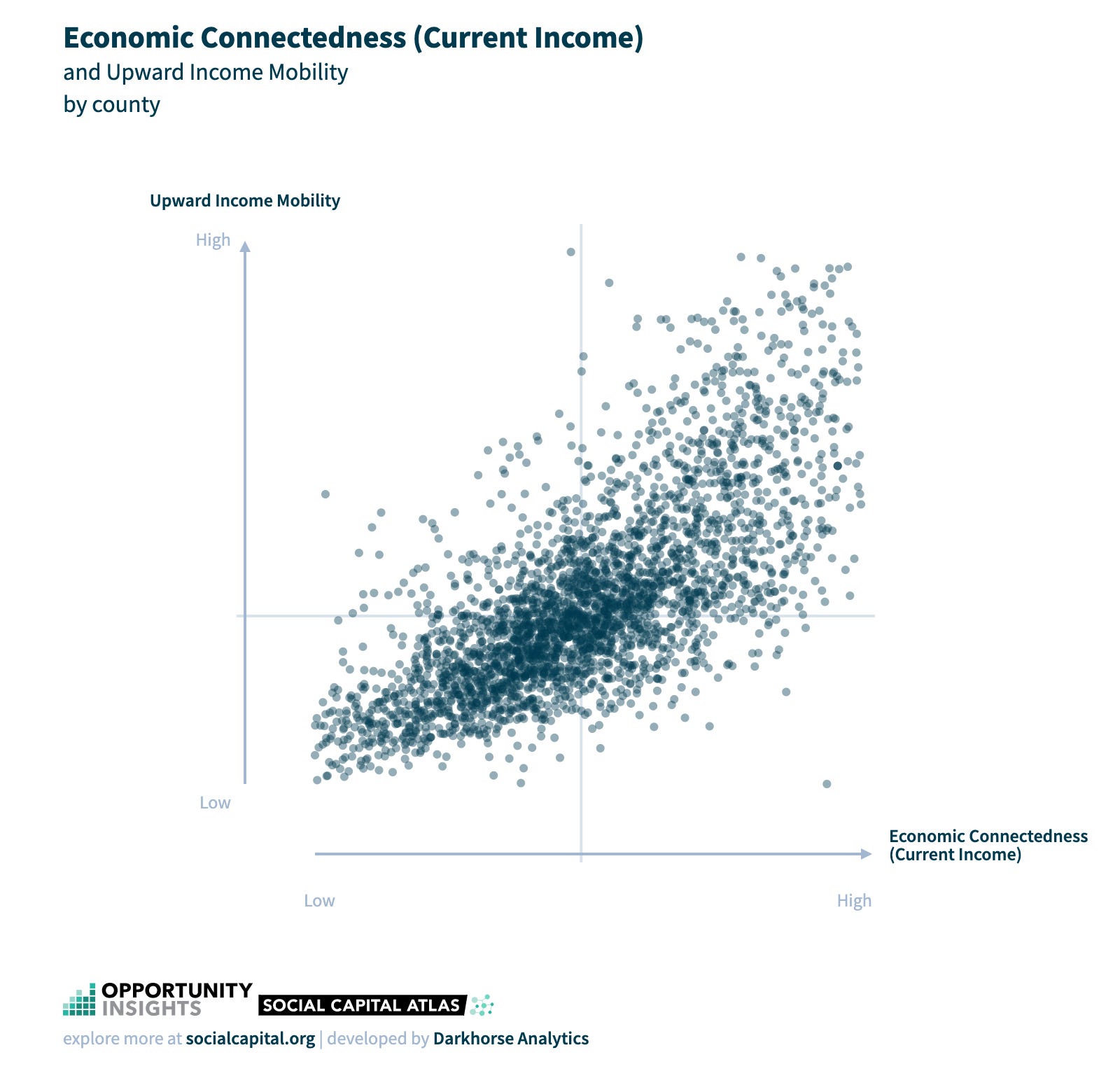Although such forms of “bonding” social capital may be important for other outcomes, the type of social capital that matters most for upward income mobility is cross-class interaction—a form of “bridging” social capital. The degree of cross-class interaction in the Opportunity Insights datasets, via the measurement of economic connectedness, was taken by calculating the share of high-income (above-median) friends among low-income (below-median) people.