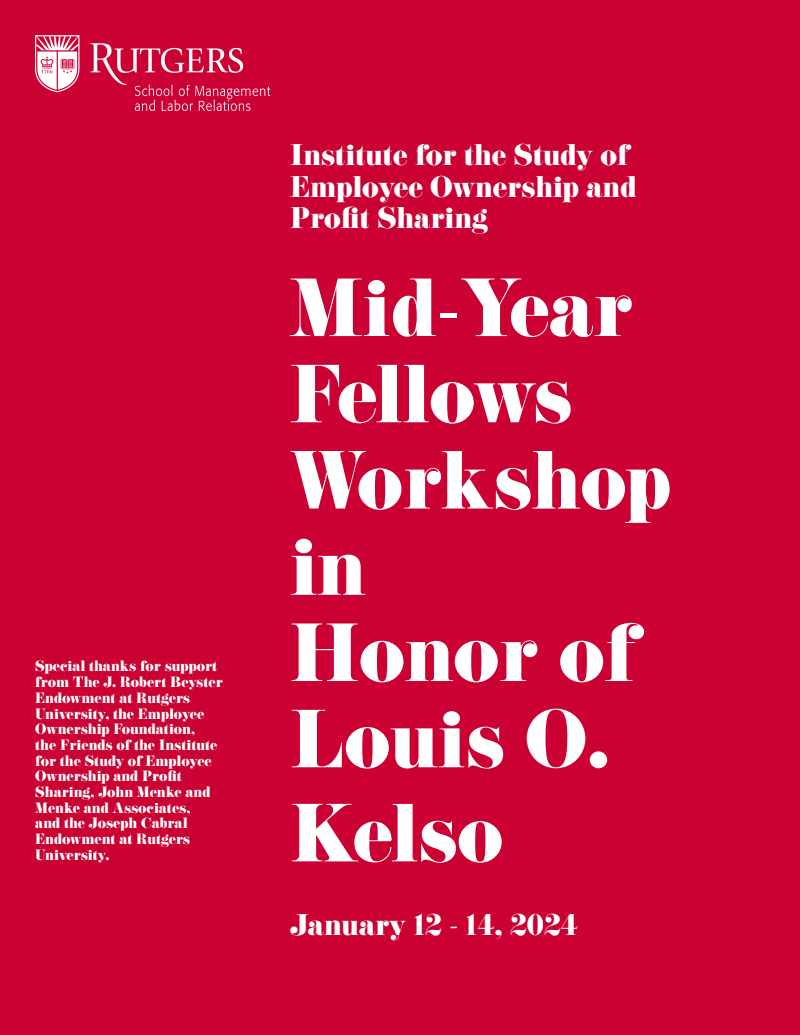 TLDR: Each January, the Rutgers Institute for the Study of Employee Ownership and Profit-Sharing hosts a midyear workshop for recipients of its annual fellowship. Learn about what’s hot in employee ownership by browsing the program for the event.