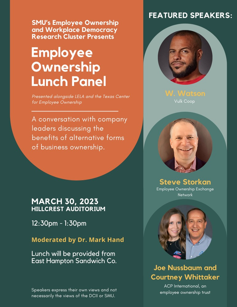 Well hear from Joe Nussbaum and Courtney Whittaker from ACP International in Arlington; W. Watson from Vulk Coop in Austin; and Steve Storkan from the Employee Ownership Exchange Network and the Texas Center for Employee Ownership. Y’all come and see us!